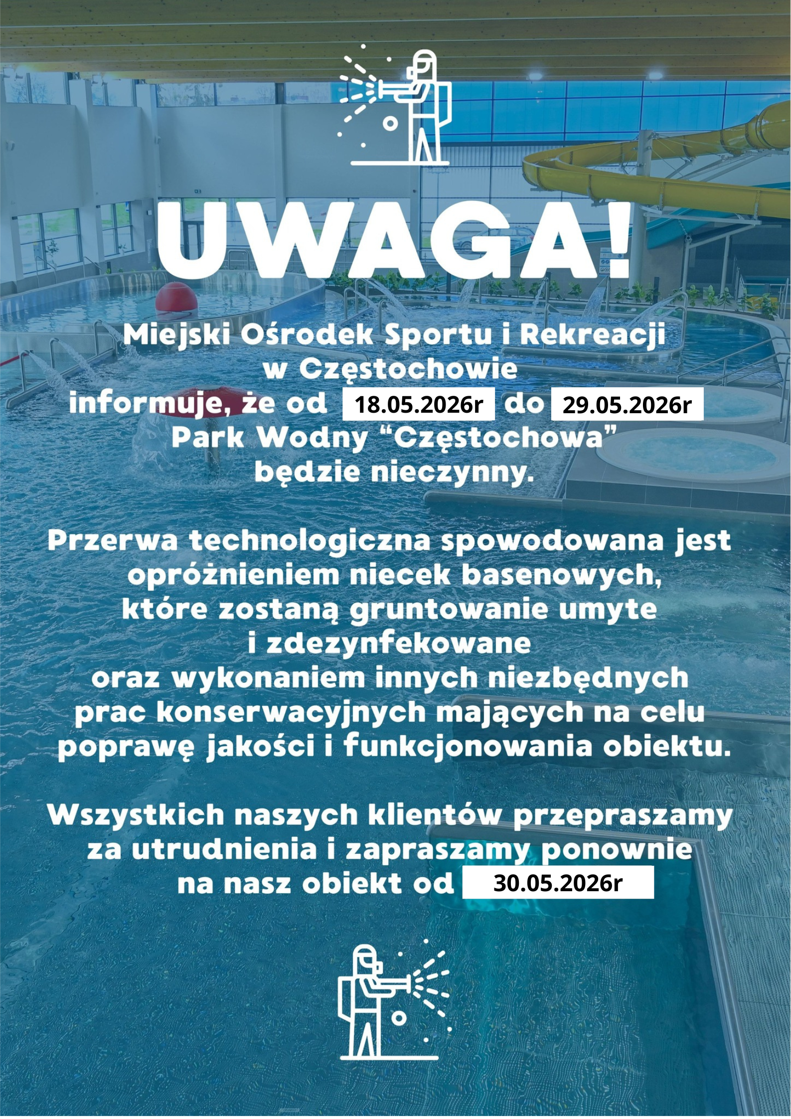 informujemy, że od 18.05.2026r do 29.05.2026r Park Wodny Częstochowa będzie nieczynny.